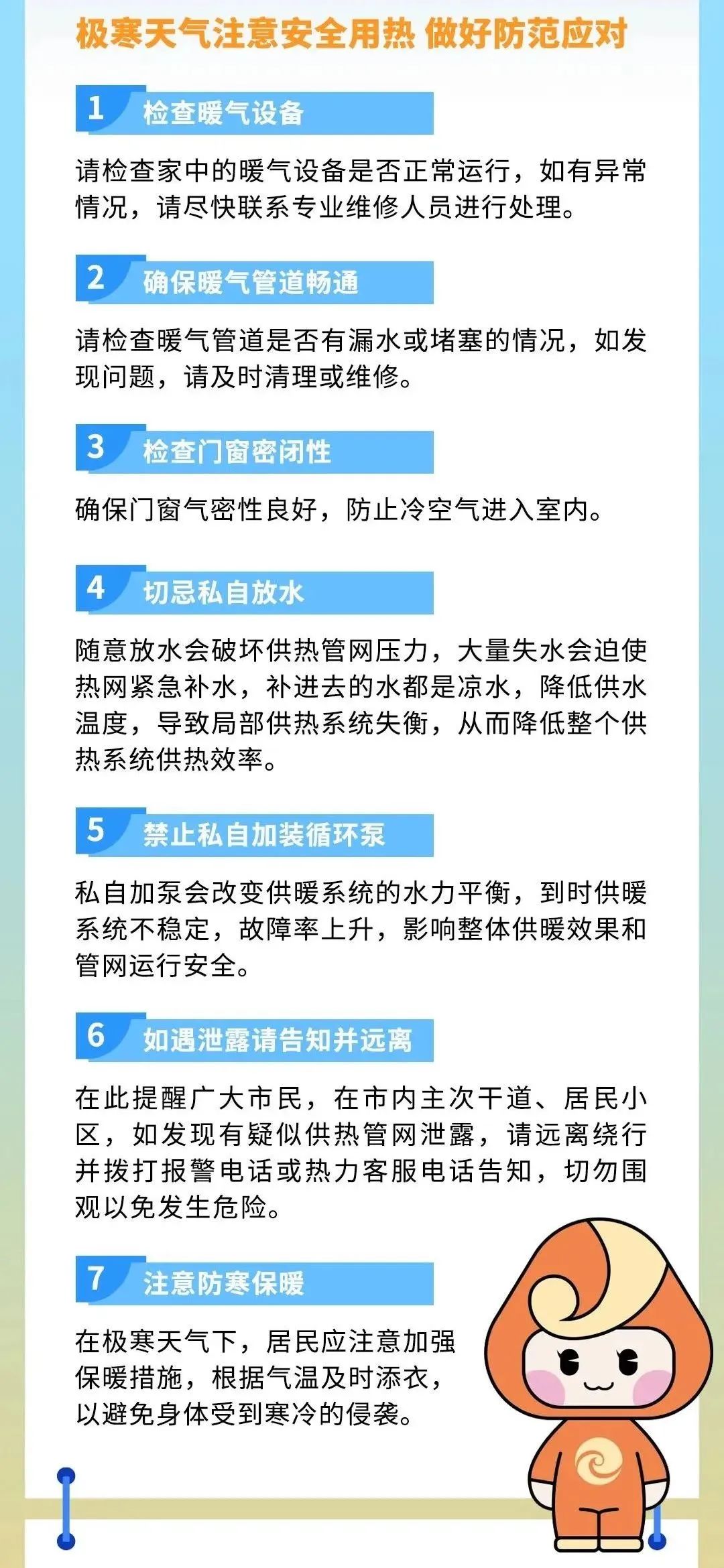 冷冷冷冷 !供暖提示要收藏 据气象部门预报,受强冷空气和偏南暖湿气流共同影响,近期我市将出现持续雨雪大风降温天气。 面对龙年首场寒潮天气,运城热力认真总结前期供热运行经验,细化部署安全生产、运行保障、用户服务等重点工作环节,多措并举应对寒潮天气,坚决扛起国企责任担当,用心用情守护万家温暖。
