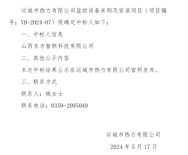 运城市热力有限公司监控设备采购及安装项目中标结果公示