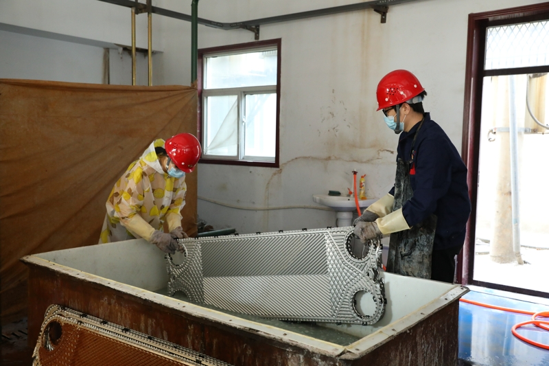 在交警支队站,马福森查看了板换清洗工作,并向二公司负责人了解设备维保、收费经营等情况,他对二公司打破岗位职责约束,对中层管理人员合理分工安排,对运行管理员、用户管理员统筹调配,全力推进设备维保的做法予以肯定。他叮嘱分公司工作人员,在分配工作任务时要本着人性化的原则,把时间调整开,尽量避开高温时段。马福森现场要求后勤负责人为一线员工购置电风扇,为室内板换清洗、阀门保养等工作创造相对舒适的工作环境;并要求总工程师办公室及相关责任部门要尽快推进生产服务综合体项目,争取早日投产达效,应用先进的清洗设备开展板换清洗工作,降低员工工作强度。